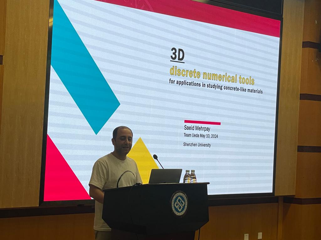在第二场报告中,MEHRPAY博士首先介绍了当下各主流离散元分析方法如格构离散粒子模型、刚体弹簧模型等,并评价了各方法的优缺点。相较于传统连续介质数值分析方法,离散元分析方法在模拟混凝土的开裂行为方面更有优势。基于RBSM的基础上,MEHRPAY博士发展了刚体耦合弹簧模型,可有效地模拟混凝土材料的泊松效应。并且MEHRPAY博士还基于数字图像相关(DIC)技术探讨了加载边界条件以及非均匀受力对单轴受压混凝土试件应力应变响应的影响规律。