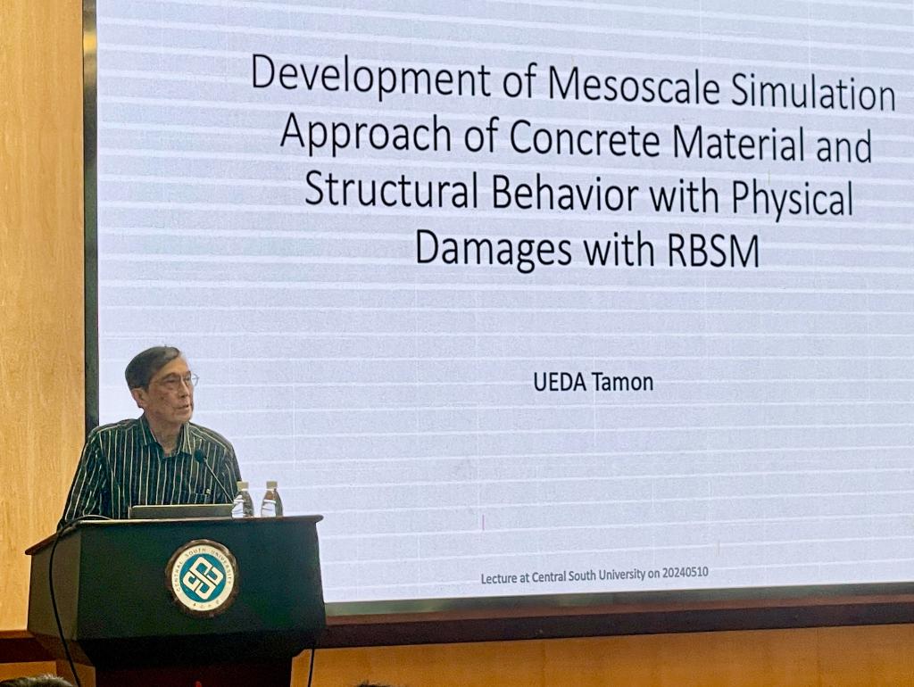 报告分为两场,在第一场报告中,UEDA教授介绍了课题组二十多年来在离散元-刚体弹簧模型(RBSM)细观模拟混凝土和混凝土结构方面的研究进展。首先,UEDA教授阐述了对混凝土损伤开展多尺度(微观、细观和宏观)分析的必要,其中细观分析可有效搭建起材料微观损伤原理和宏观失效行为间的桥梁。接着,UEDA教授介绍了应用RBSM对混凝土进行细观模拟分析的基本策略,采用文献综述的形式,介绍了RBSM在细观模拟分析混凝土受力学(静态、持续和循环加载)和环境(冻害、氯离子侵蚀等)因素作用下的本构模型以及模拟结果,展现了RBSM在模拟预测混凝土内部细观变形及开裂演化上的潜力。