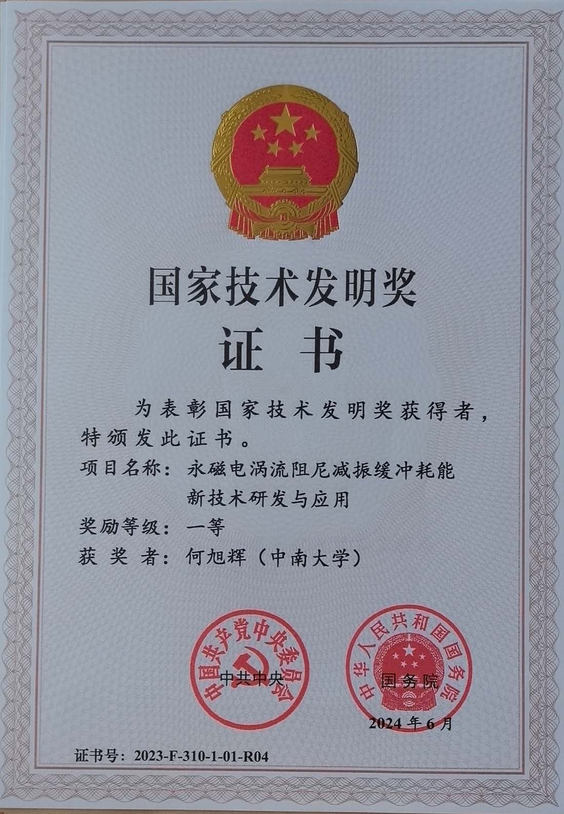 集团何旭辉教授参与完成的“永磁电涡流阻尼减振缓冲耗能新技术研发与应用”项目荣获2023年度国家技术发明奖一等奖。