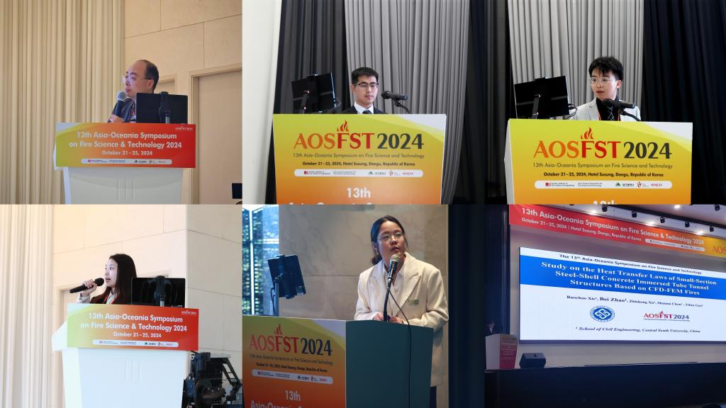 会上,消防工程系师生共作6场学术汇报:颜龙副教授作了题为“Fabrication of organophosphate-grafted mica for enhancing the fire protection, smoke suppression and anti-ageing properties of amino transparent fire-retardant coatings”的汇报,他介绍了云母粉增强透明防火涂料的阻燃、抑烟和耐候性能,并揭示了云母粉在透明防火涂料中的协效阻燃和抑烟机理,为层状硅酸盐在透明防火涂料中应用提供科学参考;博士生应后淋作了题为“Experimental study on the temperature distribution characteristics under coordinated ventilation in underground interconnected tunnel”的汇报,他介绍了地下互通隧道协同通风下的烟气蔓延特性,并提出了主、支路隧道通风影响下的最大温升与温度衰减模型,为复杂曲率地下互通工程的烟气控制提供学术支持;博士生陈奕涵作了题为“Experimental study on stratification characteristics of smoke in high-altitude tunnel under longitudinal ventilation”的汇报,他介绍了高海拔环境条件(低压、低氧、低温)下隧道火灾燃烧特性及烟气输运特征,并提出针对高海拔地区的火焰倾斜角度及火源下游烟气层Froude数预测模型,为高海拔地区隧道防排烟设计提供了科研依据;硕士生陈诗仪作了题为“An Experimental Study on the Fire Temperature Characteristic of Commuter Express Carriages with Multiple Side Doors in Tunnel of Urban Rail Transit ”的汇报,她介绍了市域快线车厢内部火灾发生时车厢内最大温升及温度衰减规律,该研究市域快线超长隧道不同车厢类型起火现实场景,阐明了最大温升及温度衰减随车厢侧门数量及车厢门开启情况变化规律,为市域快线应急救援疏散策略提供科学参考;硕士生冯赛亚作了题为“A comprehensive model to predict the fire performance of intumescent fire-retardant coating on steel substrate”的汇报,她介绍了膨胀型钢结构防火涂料在热辐射下的热解燃烧性能,该研究针对商用防火涂料建立了一个综合模型去评估膨胀型钢结构防火涂料的膨胀隔热性能,为装配式钢结构的防火保护设计提供学术支持,该报告获得了“Best Oral Presentation Award”奖项;硕士生赵蓓作了题为“Study on the Heat Transfer Laws of Small-Section Steel-Shell Concrete Immersed Tube Tunnel Structures Based on CFD-FEM Fires”的汇报,该研究针对隧道实际火灾场景,阐明了小截面钢壳混凝土沉管隧道有无防火板下,隧道结构温度传递规律,为小截面钢壳混凝土沉管隧道抗火提供科研依据。
