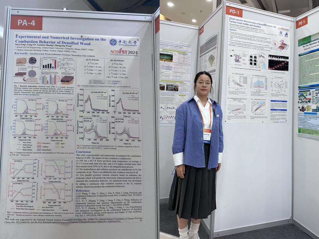会议期间,集团消防工程系共展出4张海报,涵盖了固体火蔓延、致密木材的阻燃性能模拟、致密木材的开裂研究、火灾风险识别算法4个不同的主题,硕士生冯赛亚在场为国内外研究人员讲解展示。