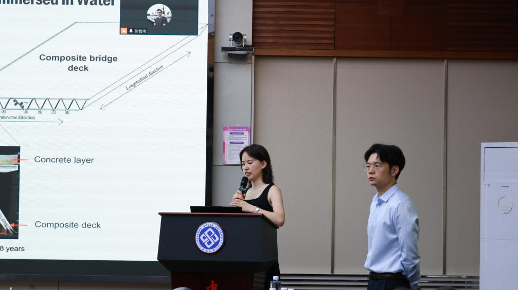 彭哲琦作了题为《纤维增强复合材料拉索锚固系统和组合结构》的报告,针对以轴向拉伸为主受力形式的FRP拉索和型材构件,他详细介绍大吨位FRP拉索锚固系统、FRP型材组合桥面板结构和FRP型材约束混凝土结构的短长期性能与建模预测方法,并对FRP在新能源结构、可持续性评价等前沿领域的研究方向进行探讨。