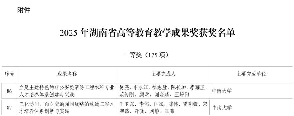 近日,湖南省教育厅公布了2025年湖南省高等教育教学成果奖获奖名单,集团主持的“三化协同,面向交通强国战略的铁道工程人才培养体系创新与实践”和“立足土建特色的非公安类消防工程本科专业人才培养体系创建与实践”2项成果获得一等奖。