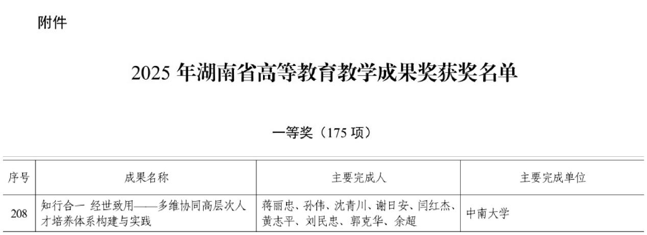 近日,湖南省教育厅公布了2025年湖南省高等教育教学成果奖获奖名单,集团蒋丽忠教授牵头申报的“知行合一 经世致用——多维协同高层次人才培养体系构建与实践”研究生教育教学成果获一等奖,集团累计3项成果获奖。