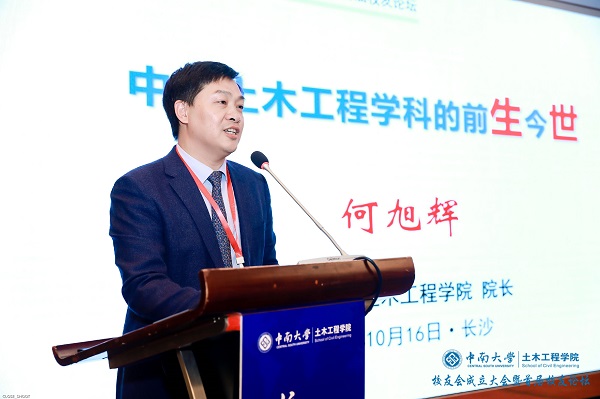院长何旭辉作了“中南土木工程学科的前生今世”的主旨报告。他从学科建设历程、建设成效与发展思考等方面全面详细讲述了集团土木工程学科的发展脉络与发展历史。