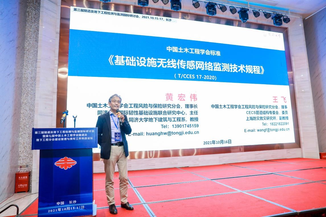 同济大学黄宏伟教授和王飞教授作题为《基础设施无线传感网络监测技术规程》的报告