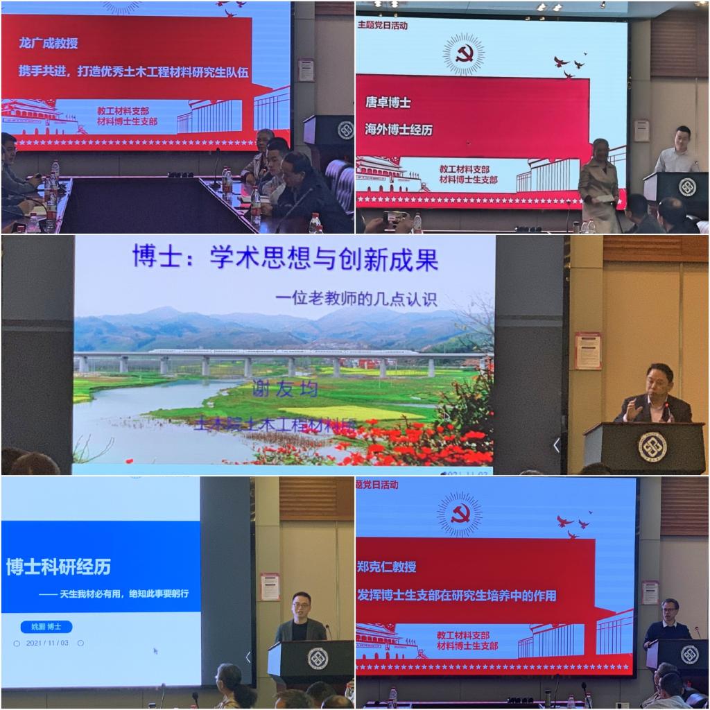 随后,材料所所长龙广成教授作了“携手共进,打造优秀土木工程材料研究所队伍”主题报告,龙广成教授指出博士生党员应起到先锋模范带头作用,维护并进一步发扬材料所内的互助共进和谐风气。师生之间应建立严谨治学,勇于探索的培养形式,形成平等互信的关系,为学院、学校和国家的发展建设增光添彩。原土木院院长谢友均教授作了“博士生培养:学术思想与创新成果”主题报告。谢教授从自己的学习、科研经历出发,为博士生规划了发展路线,即前期形成学术思想,后期获得创新成果。提出学术思想与创新成果是科研工作的永恒主题。谢教授指出,土木工程学科的研究生要立志做出高于工程实践的科研成果,以积极进取与团结协作等精神将其应用于服务工程中去。唐卓、姚灏两位青年老师分别从“海外博士经历”与“博士科研之路”两个角度进行汇报,生动回答了博士生所关心的国外博士培养模式及良好科研习惯养成的问题。材料博士生支部书记郑克仁教授作了“发挥博士生支部在研究生培养中的作用”主题报告,郑教授分析了研究生在科研工作中的问题现状,国家发展、强盛需要一大批优秀的高端人才,这就要求博士生党员坚定信念、勇担重任,通过科研攻关勇于挑战自我、提升眼界和个人定位,实现人生价值。五位教师党员代表的报告使与会研究生收获良多。