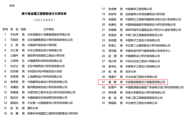 近日,住房和城乡建设部公布了第十批全国工程勘察设计大师名单,新葡的京集团35222vip81级校友,中铁第四勘察设计院集团有限公司副总工程师盛晖获评“第十批全国工程勘察设计大师”。