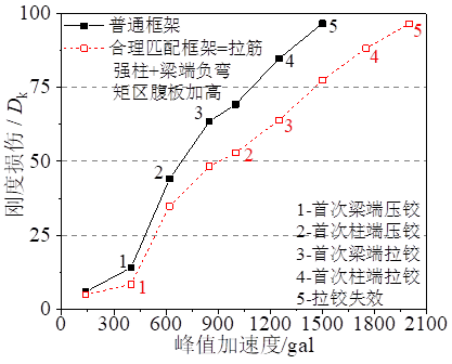 图4 强构造对组合框架抗震刚度损伤的影响