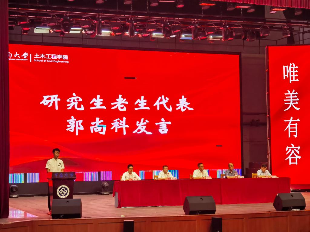 新葡的京集团35222vip党委书记蒋琦玮代表学院向新同学们表达衷心的祝贺和热烈的欢迎,向家长们表达了诚挚的感谢。在2023级土木学子研究生阶段的启航之际,蒋琦玮书记与大家分享了三点要求和希望:一是要凝心铸魂,做忠诚于党的追随者。他指出,坚定的理想信念,永远是激励我们奋勇向前、克难制胜不竭的力量源泉;二是要求真唯实,做勤学实干的奋楫者。他鼓励同学们主动肩负起科技自立自强的历史使命,大力弘扬追求真理、勇攀高峰的科学精神,传承老一辈科学家以身许国、心系人民的光荣传统,把创新论文写在祖国大地上,把创新成果落在三湘四水间;三是要精进致远,做追求卓越的攀登者。他希望同学们以不懈的探究精神、顽强的钻研精神,在勇攀科研高峰的征途上不断超越自我,在追求学术卓越的道路上精进致远,求一等学问、成一流人才。鼓励作为工程学科研究生的同学们将学科前沿与解决国家重大需求相结合,通过解决工程问题培养科研能力、提升学术素养,成长为具有全球视野、知能兼备的复合型、创新型土木人才。