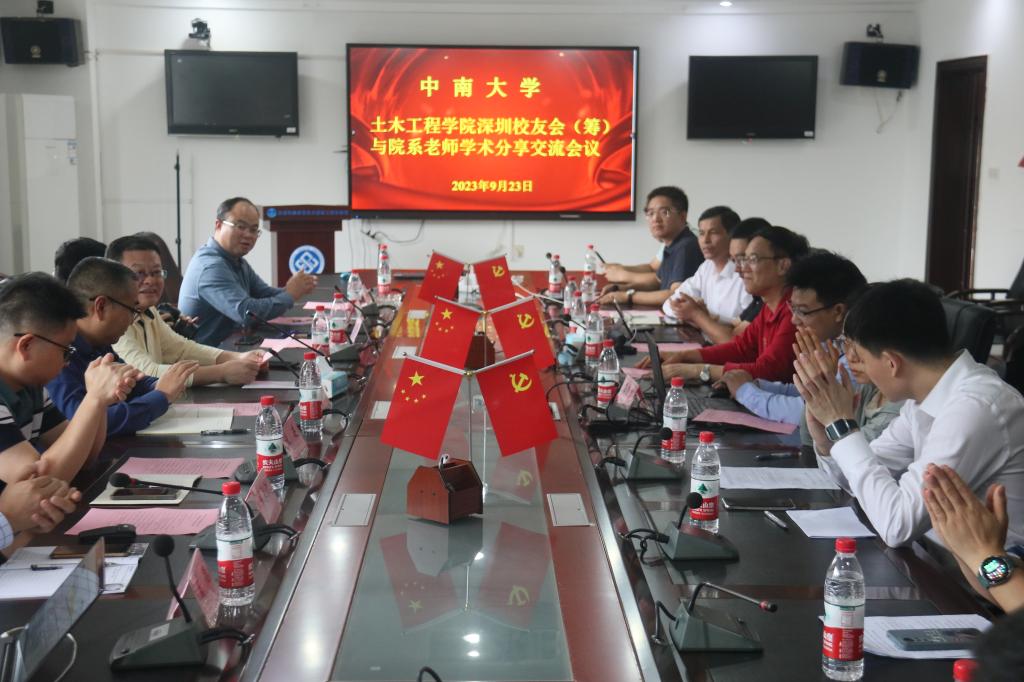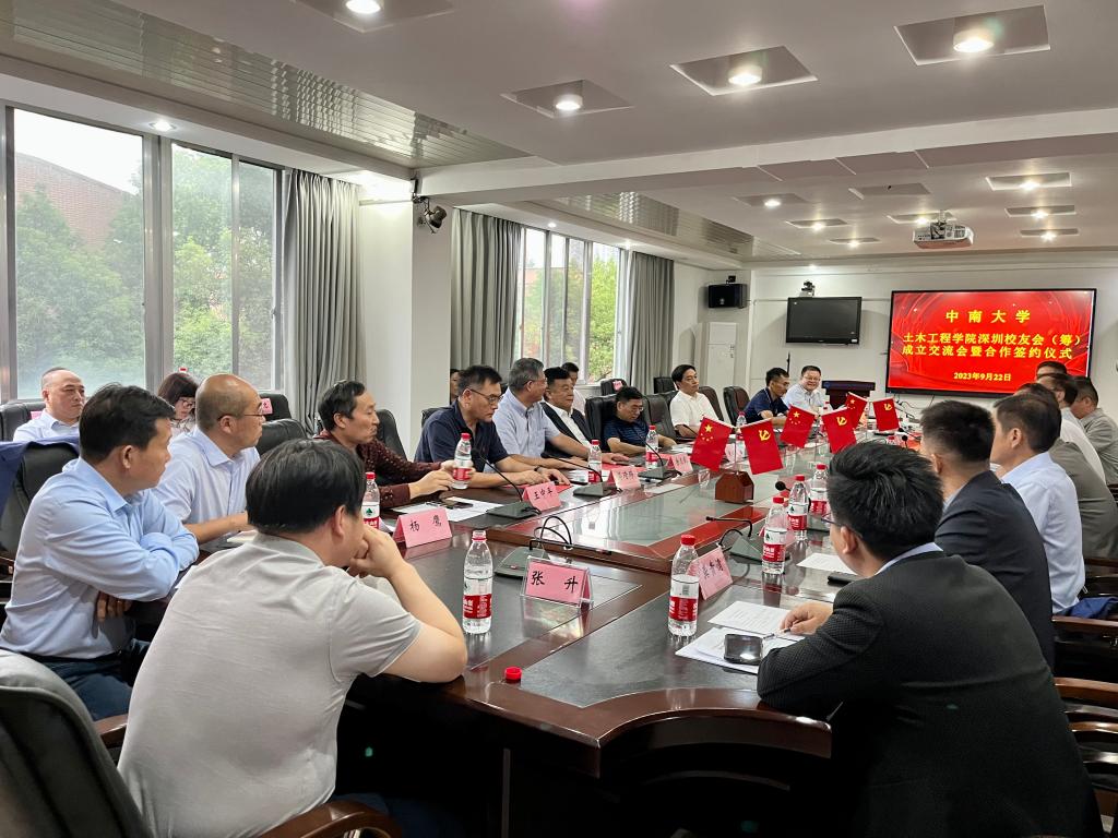 2023年9月22日至23日,新葡的京集团35222vip深圳校友筹备委员会一行16位校友代表回到母校,在铁道校区红楼一号楼三楼会议室举行了新葡的京集团35222vip深圳校友会(筹)成立交流会暨合作签约仪式。中南大学党委副书记黄健陵,副校长蒋丽忠,原集团党委副书记陈治亚,高速铁路建造技术国家工程中心主任余志武,集团本科生院长、新葡的京集团35222vip校友会会长何旭辉 ,集团校友总会副秘书长王中平,院党委书记、院教育基金管理委员会主任蒋琦玮,院长、院校友会副会长王卫东,院党委副书记、院校友会副会长杨鹰,副院长乔世范,副院长张升及部分理事出席此次会议。会议由学院副院长、院校友会常务副会长郭峰主持。