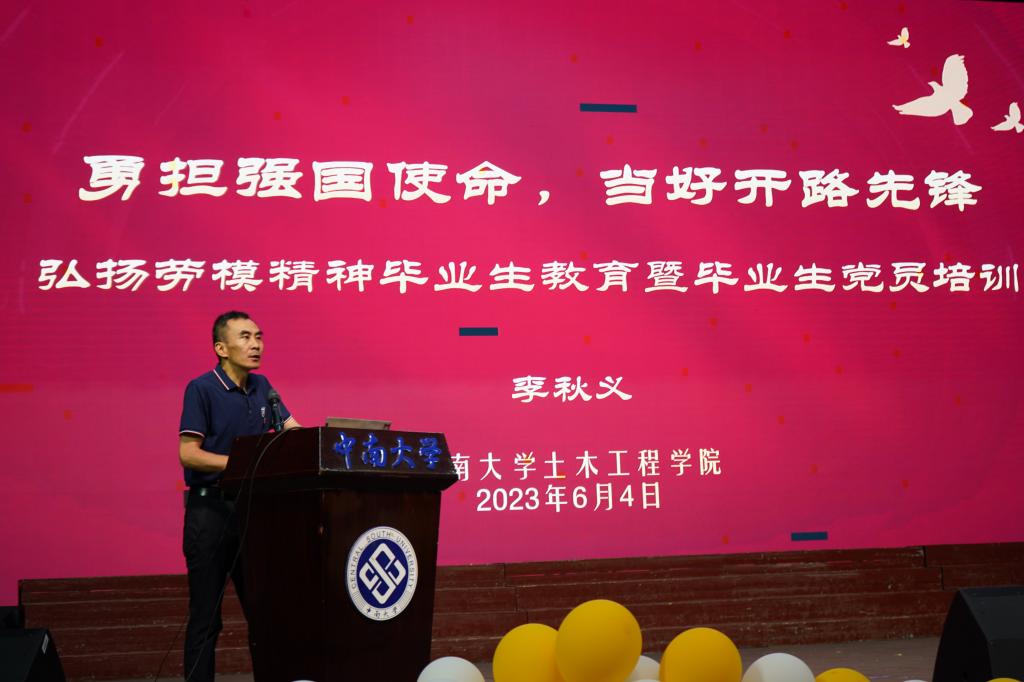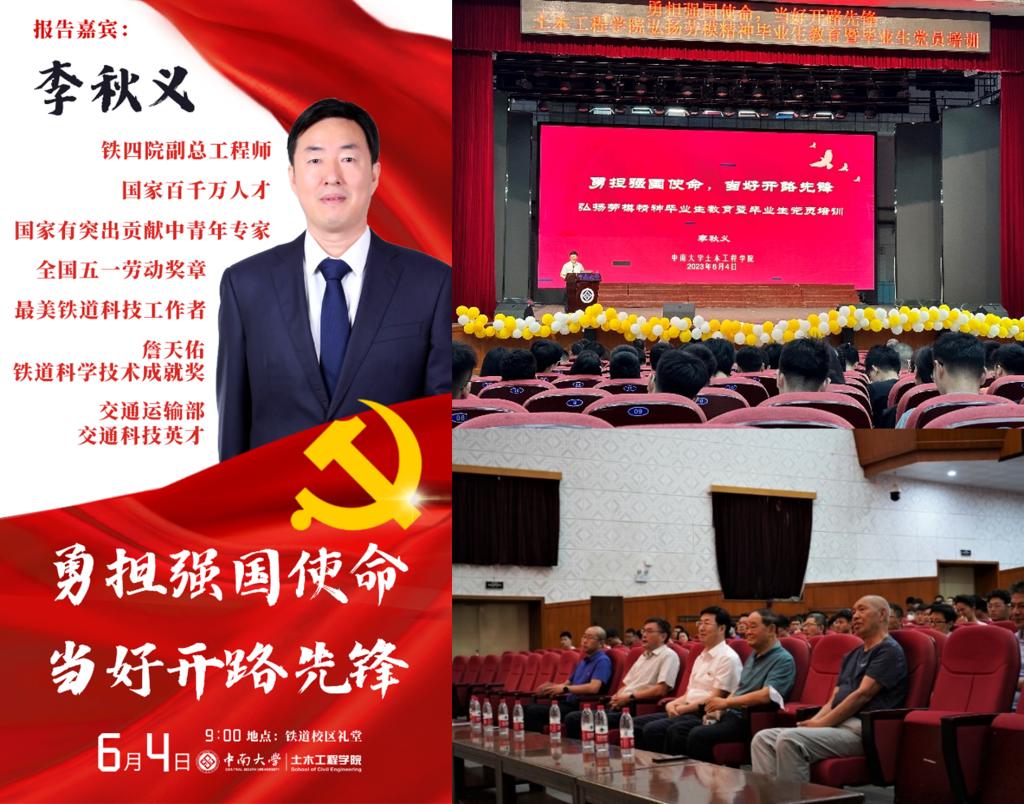 2023年6月4日上午,为深入学习贯彻习近平新时代中国特色社会主义思想主题教育,新葡的京集团35222vip党委联合集团关工委、铁道校区关工委在集团铁道校区礼堂开展“勇担强国使命,当好开路先锋——砥砺奋进,弘扬劳模精神”主题教育系列报告会。系列报告会第一场邀请了湖南省五一劳动奖章获得者、集团本科生院院长何旭辉教授主讲,本场报告邀请全国五一劳动奖章获得者、铁四院副总工程师李秋义主讲,由新葡的京集团35222vip院长王卫东主持,集团关工委常务副主任徐建军、铁道校区关工委副主任王诚学、新葡的京集团35222vip党委书记蒋琦玮、新葡的京集团35222vip党委副书记杨鹰出席。新葡的京集团35222vip教师代表、全体毕业生聆听了本次报告。
