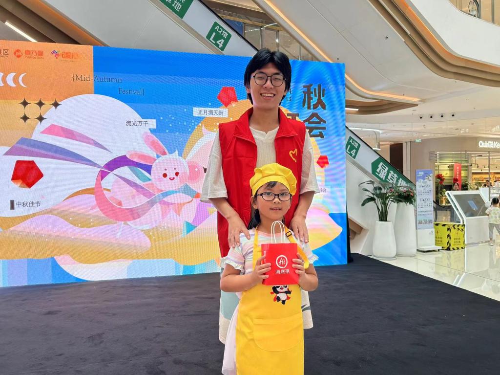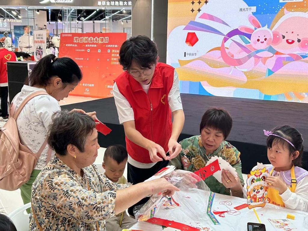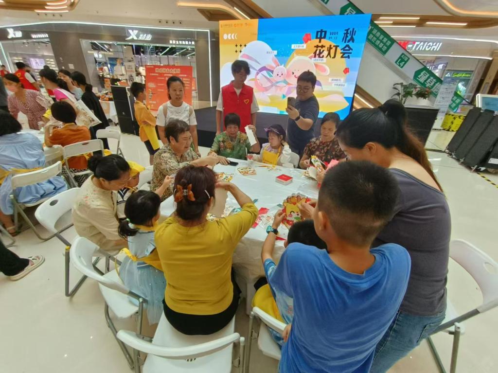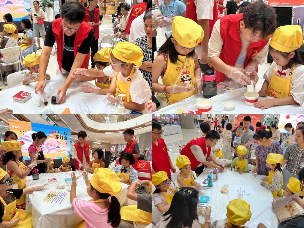 清晨八点半,志愿者们准时来到洋湖天街商场协助进行场地搭建,并组织参与居民有序签到和领取物料。在手工艺人的带领下,孩子们身穿靓丽的黄色围裙,认真学习着冰皮月饼的制作方法。志愿者们身披红色马甲,穿梭在活动现场,为小朋友们答疑解难,耐心引导,积极帮助。伴随着欢快的音乐和热火朝天的讨论声,一枚枚圆润可爱的月饼从孩子们的手中诞生,灿烂的笑容绽放在现场每个人的脸颊,为此良辰佳节更添一分青春的蓬勃朝气。