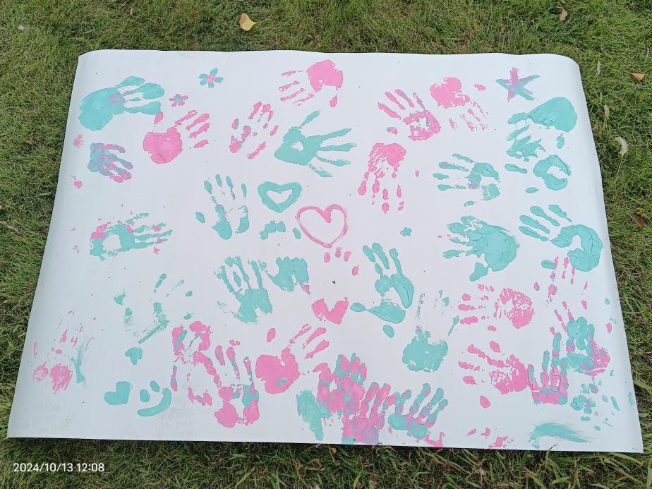 除了观摩烈士公园,还设置了休闲的小游戏环节,包括红色寻宝活动、接球小游戏和按手印活动。其中,令全体成员最印象深刻的是有趣的按手印环节,志愿者们将水溶性颜料铺在纸上让残疾人们用手掌蘸取,随即按在了一张很大的白纸上面,随着按手印的志愿者和残疾人士们越来越多,白纸上逐渐呈现出了一幅“手掌画”,粉蓝相间,十分漂亮,大家看着画都露出了心满意足的微笑。