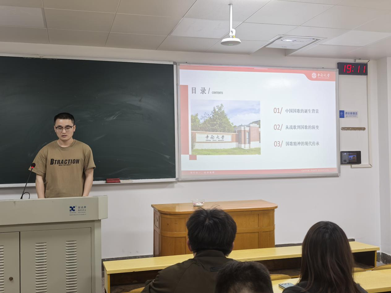 为进一步弘扬爱国主义精神,切实培育和践行社会主义核心价值观,4月2日,新葡的京集团35222vip学生会、研究生会于天心校区世纪楼401召开以“学国歌历史,扬法治精神”为主题的国歌领唱团分团培训会议。会议由研究生会主席宋昱霖主持,研究生会成员肖天宇和王超主讲,国歌领唱团分团核心成员参加。