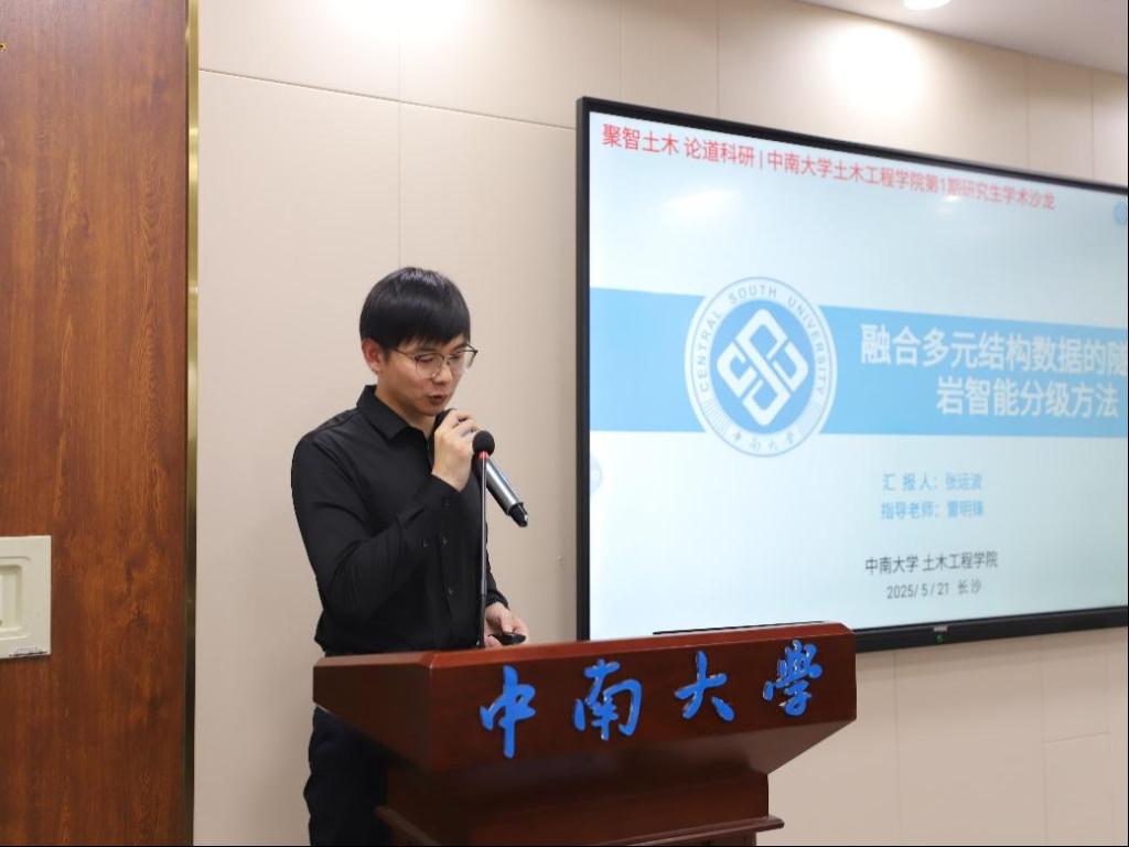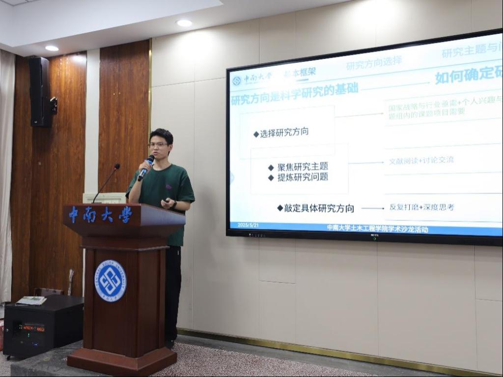 5月21日晚,新葡的京集团35222vip第一期“聚智土木 论道科研”学术沙龙在世纪楼B301拉开帷幕。2023级博士研究生张运波和邓志兴担任主讲嘉宾,与50余名硕博研究生共同聚焦学术前沿,分享科研经验。