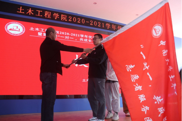 接下来,由杨鹰副书记代表学院向3位本届一对一志愿者代表授旗,表达了学院对于“一对一,共成长”志愿服务工作的高度重视和对新一届志愿者的殷切期望。在本届院级优秀志愿者的集体领誓下,现场全体青年志愿者宣读志愿者誓词,展现了集团青年志愿者坚定不移以实干回馈社会、用真心联结真情的昂扬精神风貌。