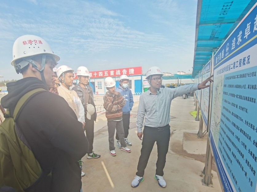下午2点,全体同学从新校区毓秀楼前坪乘车前往长沙市轨道交通2号线西延线项目,首先到达项目施工现场参观,在项目经理黄杉的讲解下,同学们了解到项目当前建设状况及工程项目建设在长沙市交通规划中的重要作用。