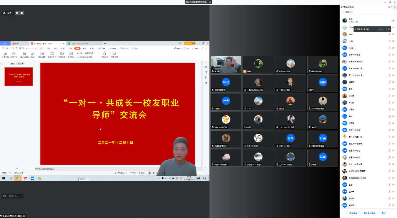 12月10日晚9点,由学院团委副书记潘文彬老师主持开展线上会议,为学生介绍了此次校友职业导师计划的工作安排及相关事项。本次活动从多家优质单位中择优选择了16位校友职业导师,通过新葡的京集团35222vip研究生会发放报名通知,并为报名的46名同学按照志愿匹配了合适的导师。