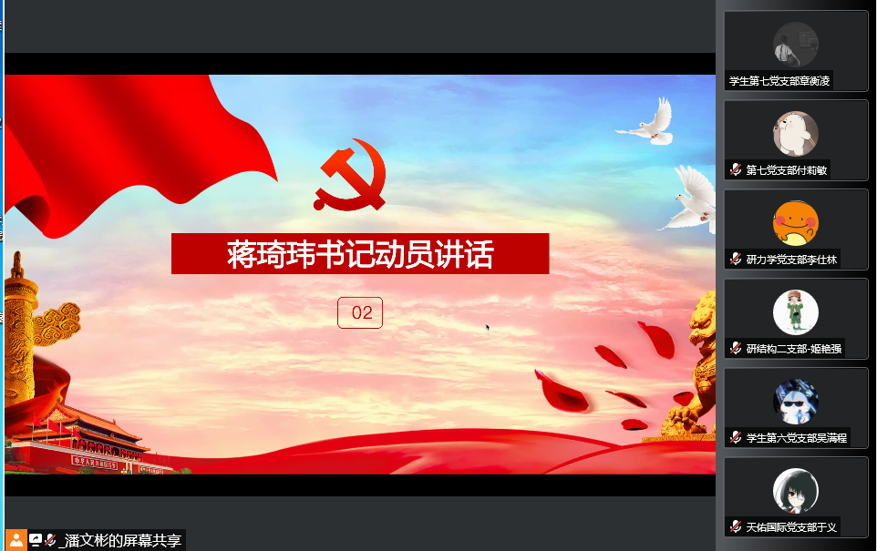 会议第二项,蒋琦玮书记进行动员讲话,蒋书记表达了对各位同学成为发展对象的祝贺,同时也对同学们提出了一些要求。在全面从严治党和严格发展党员标准的背景下,蒋书记希望同学们能够做到学与思结合,通过学习党的基本知识,增长自身的理论知识,增强信心与斗志,自觉地牢记使命;做到实事求是、知行合一,在培训中带着问题学习、带着行动学习,将理论知识外化为自身行动;以党员标准严格要求自己,通过自身的努力不断缩小和党员标准之间的差距。通过发展对象培训班的学习,蒋书记希望同学们能够加强自己的政治判断力,政治领悟力,政治执行力。蒋书记还提到了冬残奥会的表彰大会上习总书记提出的“胸怀大局、自信开放、迎难而上、追求卓越、共创未来”的北京冬奥精神。蒋书记希望各位同学们做一个有理想,有本领,有担当的新时代青年,坚持立德树人的使命。此外,当前正处于抗疫关键时刻,蒋书记希望各位积极分子主动承担责任,在疫情防控中作出表率,以自己的实际行动,迎接党的二十大的胜利召开。