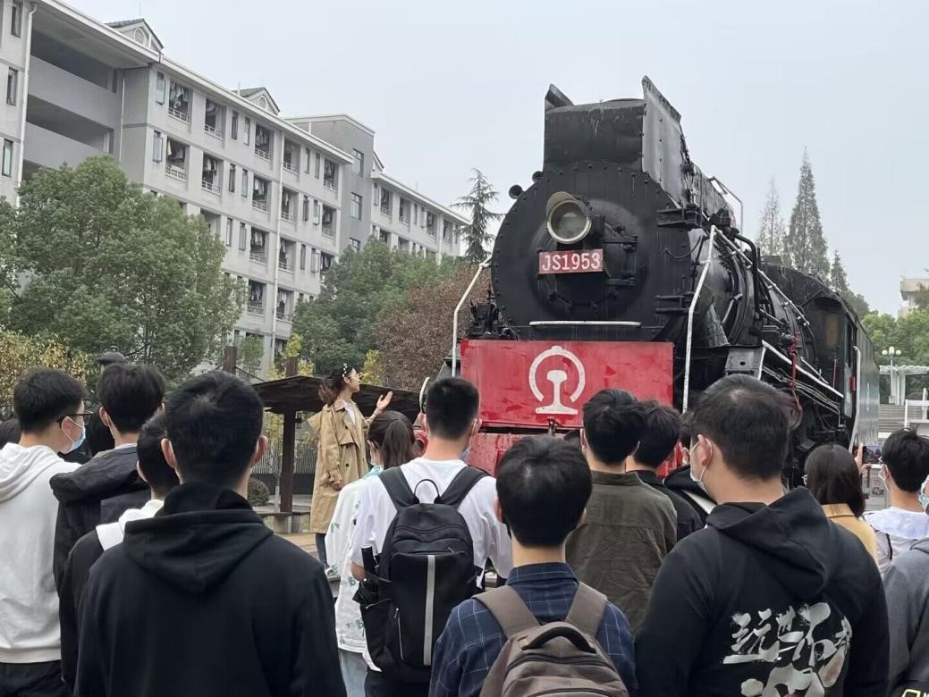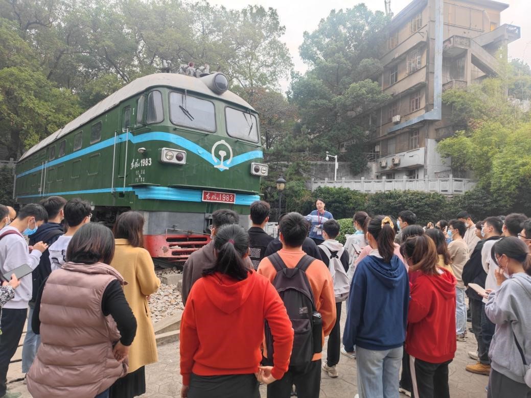 讲解员对机车上铭牌含义的讲解给各位学员留下了深刻的印象,上方左边的“绿皮车”标的是1983,为东风4型内燃机车,是中国火车发展史上内燃机车的代表。右边标有的2013则是三辆火车机车中最先进的,它是电力机车的代表。而最下方广场上的标有1953的则是最有年代的蒸汽机车,同时,1953年为中南土木建筑学院铁道系组建的年份,数字1953有着纪念铁道学院的前身的含义。