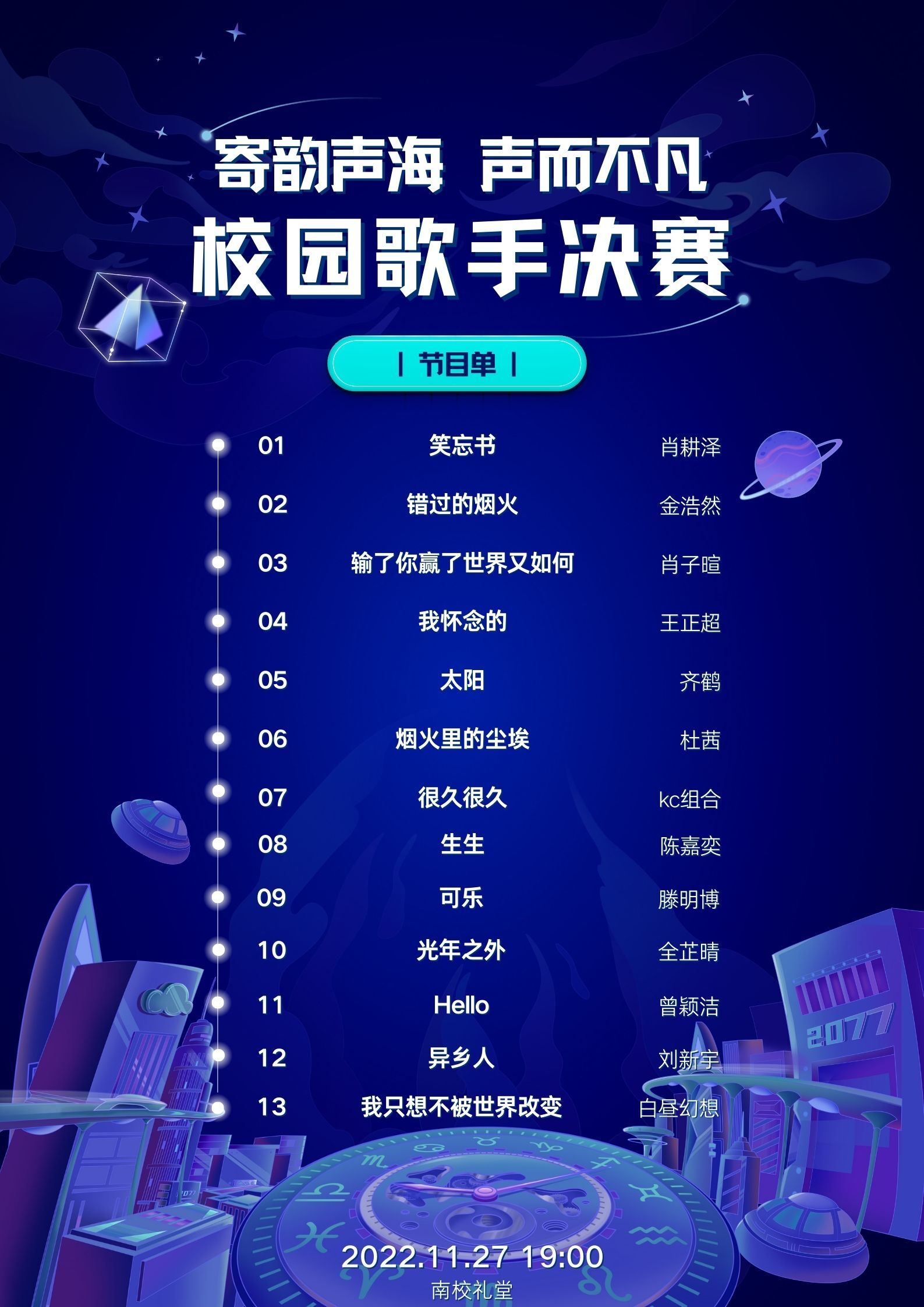 2022年11月27日晚上7点,由共青团新葡的京集团35222vip委员会主办,新葡的京集团35222vip学生会、研究生会协办的“寄韵音海,‘声’而不凡”十佳歌手决赛在线上举行。为响应疫情防控政策,观众通过线上直播观看比赛。本次比赛共有11名选手及2个组合进入决赛,由刘奕均、田雨鑫、钟可、张绍伦主持。