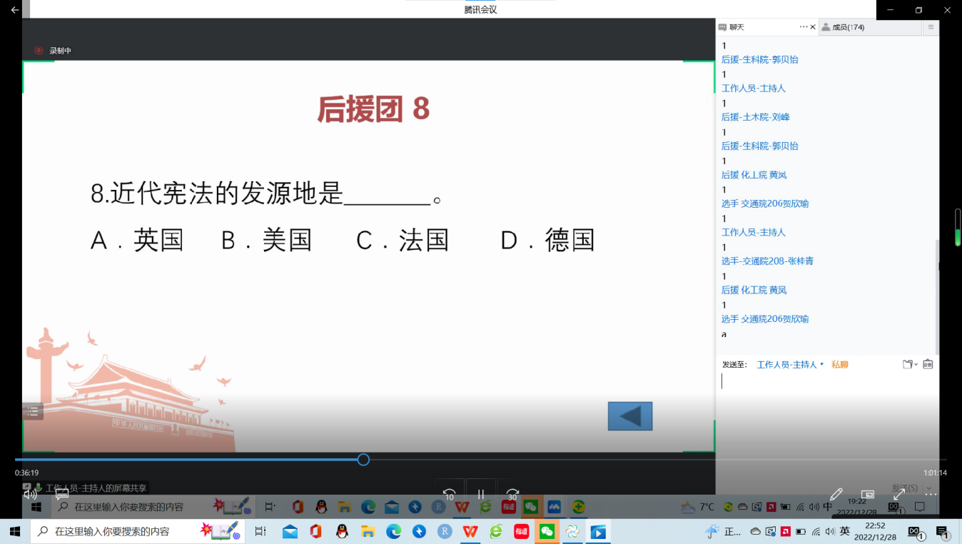 为了进一步学习宣传党的二十大精神、学习宣传习近平法治思想、学习宣传宪法、学习宣传现行宪法公布施行40年的深远历史意义,“宪启风华四十载——七院联合宪法理论培训友谊赛”于2022年12月28日晚7点举行,此次友谊赛由新葡的京集团35222vip肖文杰同学主持。