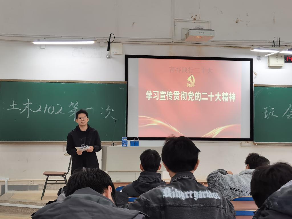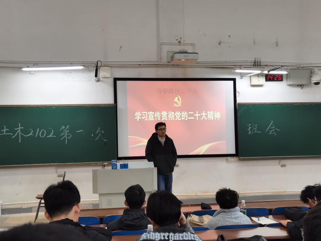 2023年3月3日下午14点,土木工程2102班在新校区D座106开展了大二下学期第一次班会。本次班会由班长杨佳诚主持,班导师周浩出席,土木工程2102班全体同学到场。