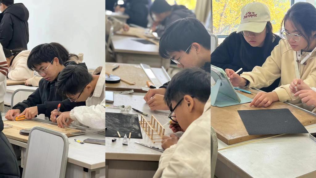 活动伊始,优秀学长向大家科普了桥梁结构设计相关知识以及数字建模软件基础知识,并依据自身参赛经验分享制作手工模型过程中常见难题与解决办法。随后让同学们从实践出发,亲自动手设计搭建小木桥。本次实践任务需要参与者利用木棒和胶水等简单材料构建出牢固、精巧的桥梁模型,要同时兼顾如何更高效、精简地利用材料并保证所设计的桥梁能够承受更高的荷载。