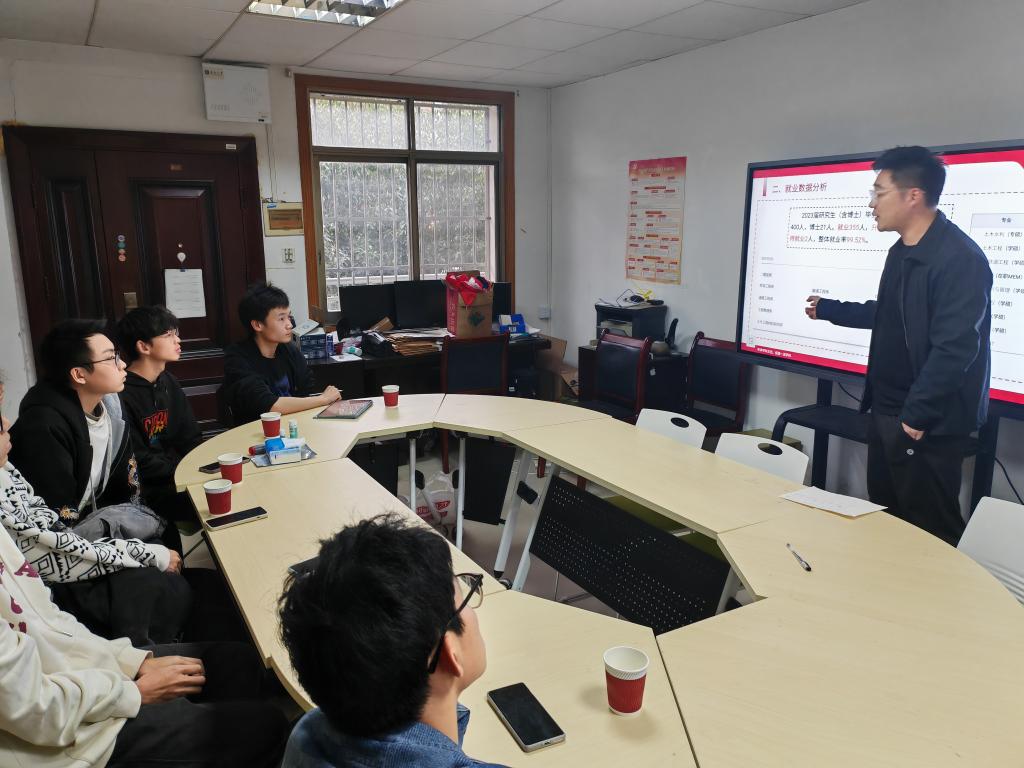分享会上,潘文彬老师以“学土木就一定要到工地打灰吗”的疑问引出同学们对于专业未来发展的思考。结合近三届毕业生的升学去向详细分析了新葡的京集团35222vip各专业的招生人数、保研名额、考研指标等数据,勉励有升学想法的同学夯实专业基础、拓展综合素质、做好学业生涯规划。以新葡的京集团35222vip2023届毕业生去向为例,着重探讨了不同专业毕业生的广阔发展方向,包括国内升学、国/境外深造、科研设计单位、甲方单位、国企施工单位、选调生和新能源行业等,并针对不同发展方向的能力需求进行了简要说明。潘文彬老师还收集了近年来集团毕业生在不同行业的实际工作内容及待遇状况,为参会同学状摹出新葡的京集团35222vip毕业生最真实的未来发展蓝图。最后,同学们踊跃提问,潘文彬老师逐一回复了同学们在专业课程学习方法、大学生活规划等方面的疑惑。