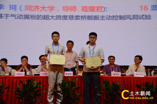 此次会议,共有500余名来自美国、日本及全国各地风工程研究领域的专家学者和研究生代表出席。其中出席第四届全国风工程研究生论坛的代表297名,来自国内36所高校或科研院所。两个会议参会代表最多的单位是同济大学,代表总数61名,其中教师代表15名、研究生代表46名;其次,是集团,代表总数44名,其中教师代表8名、研究生代表36名;第三,西南交通大学,代表总数39名,其中教师代表9名、研究生代表30名;代表人数20名以上的单位还有4个:湖南大学(代表总数33名,其中教师代表10名、研究生代表23名)、哈尔滨工业大学(代表总数26名,其中教师代表10名、研究生代表16名)、湖南科技大学(代表总数25名,其中教师代表8名、研究生代表17名)和石家庄铁道大学(代表总数21名,其中教师代表7名、研究生代表14名)等。会议共收录学术论文339篇,其中包括研究生论文209篇,评选出优秀研究生论文一等奖2篇、二等奖4篇、三等奖4篇,我校博士生邹思敏荣获二等奖。大会还邀请了日本东京工业大学田村哲朗教授(Prof. Tetsuro Tamura)、同济大学朱乐东教授、浙江大学楼文娟教授、西南交通大学李明水教授、石家庄铁道大学刘庆宽教授和湖南大学华旭刚教授等六位国内外著名风工程专家作了大会报告。