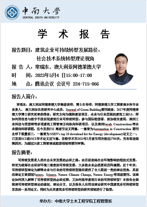 工程管理系学术讲座预告:建筑企业可持续转型发展路径——社会技术系统转型理论视角