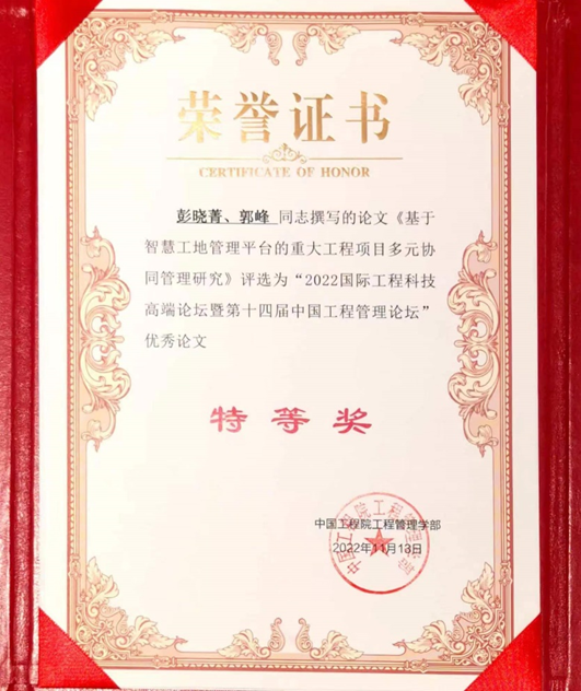 11月13日,论坛闭幕式由陈晓红院士主持,中国工程院院士何继善等20余名院士、30余名特邀专家出席论坛闭幕式。中国工程院院士、中国工程院党组书记、院长李晓红,湖南省人民政府副省长陈飞致闭幕辞,中国工程院院士、中国工程院工程管理学部主任卢春房作论坛总结。在闭幕式中,组委会颁发了论坛优秀论文奖(分为特等奖、一等奖和二等奖)和特别贡献奖。何继善院士获特别贡献奖,集团郭峰教授、彭晓菁同学撰写的论文《基于智慧工地平台的重大工程项目多元协同管理研究》被评选为“2022国际工程科技高端论坛暨第十四届中国工程管理论坛”优秀论文特等奖。