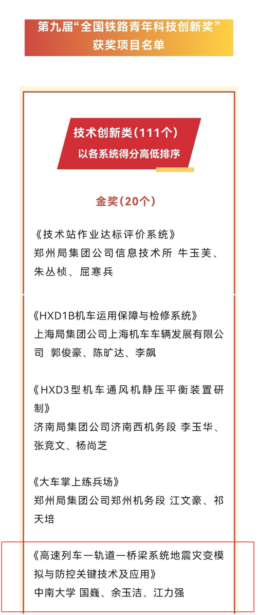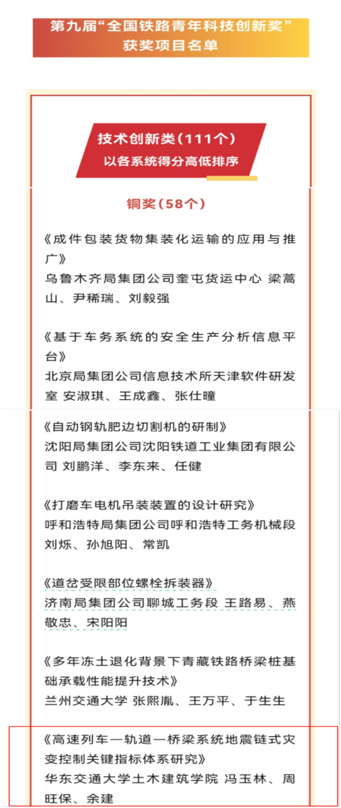 近日,全国铁道团委联合国铁集团科信部、铁道学会开展的第九届“全国铁路青年科技创新奖”评选活动落下帷幕,全国铁道团委发布了第九届 “全国铁路青年科技创新奖” 评选表彰结果。集团国巍教授、余玉洁教授、江力强副教授团队项目《高速列车-轨道-桥梁系统地震灾变模拟与防控关键技术及应用》喜获技术创新类金奖,周旺保教授、余建博士参与项目《高速列车—轨道—桥梁系统地震链式灾变控制关键指标体系研究》喜获技术创新类铜奖。
