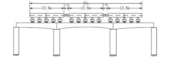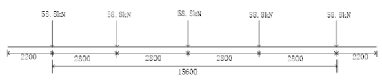 由于磁浮列车车速较低,车-桥耦合作用不明显,故磁悬浮列车采用移动荷载模拟。列车编组形式为前车30t+中车30t+尾车30t,每节列车包含5个转向架,列车子系统与桥梁子系统通过电磁悬浮力相互作用,将每个转向架与桥梁系统之间里的作用形式简化为集中荷载,最终得到一辆车的荷载模拟的形式如下图所示。