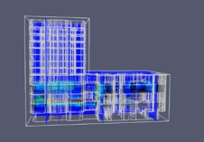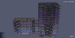 利用Pathfinder建立高层建筑火灾人员疏散行为预测物理模型,设置人员性别、年龄比例,目前一层商店、二层宴会厅、五层客房的工况及分析已经完成。