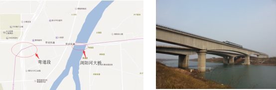 现场试验选取了浏阳河大桥上的一座三跨(85m+110m+85m)变截面预应力混凝土双线(直线)连续梁桥;25m直线简支梁;加速段、减速段25m直线简支梁;及弯道处简支梁进行测量,并研究这些桥梁在运行列车荷载作用下的动力响应。下左图所示为浏阳河大桥及弯道段在地图上的相对位置,直线简支梁在浏阳河大桥附近选取,加、减速段在磁浮列车高铁站附近选取。下右图所示为浏阳河大桥现场图。