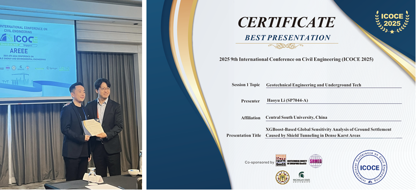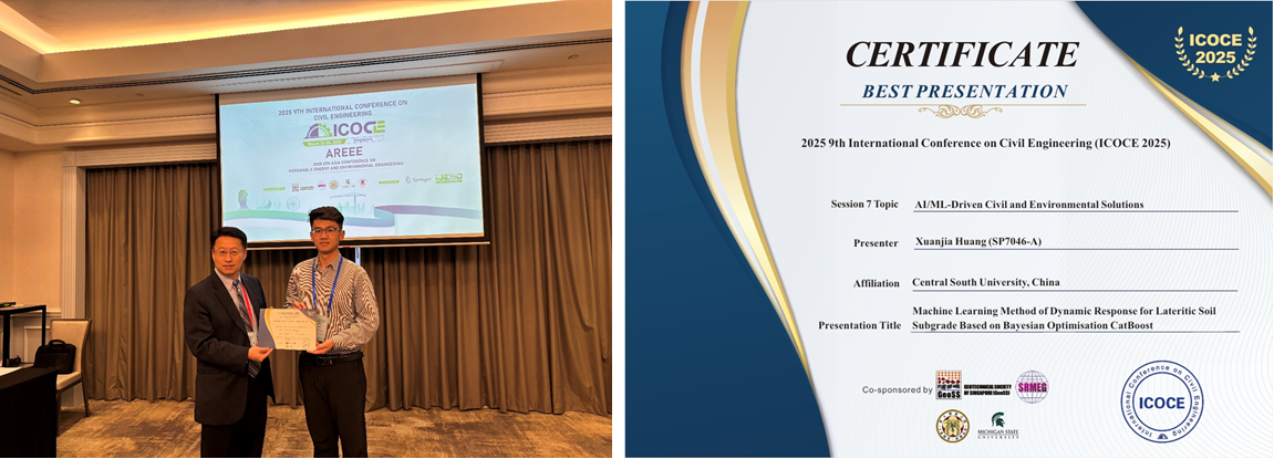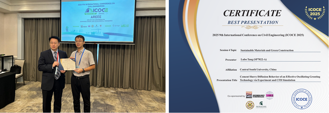 3月22日至24日,第9届国际土木工程会议(9th International Conference on Civil Engineering,ICOCE 2025, Singapore)在新加坡隆重召开,集团岩土工程系博士生唐禄博、李镐羽、鲁立、喻昭晟、周雨婷及高铁中心博士研究生黄轩嘉参会,并作分会场学术报告。其中,唐禄博、李镐羽、黄轩嘉荣获最佳汇报奖。