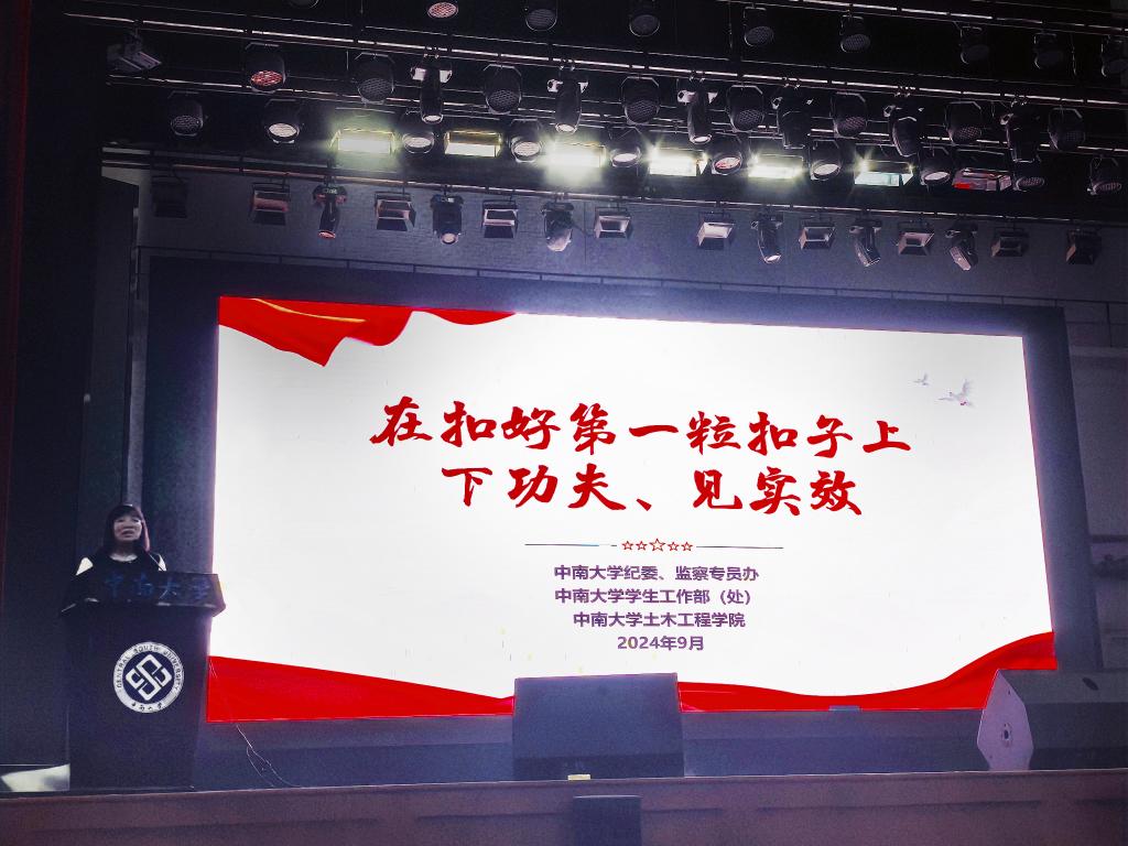 学院党委副书记纪晓飞以《在扣好第一粒扣子上下功夫、见实效》为题作“一个不能少”2024级新生廉洁教育宣讲。她从坚定理想信念,扣正“第一粒扣子”、严守纪律规矩,扣牢“第一粒扣子”、用于担当奋斗,扣好“第一粒扣子”三个方面进行讲述。她强调,全体研究生务必严守纪律规矩,勇于担当奋斗,扣正扣牢扣好“第一粒扣子”,以广大优秀中南校友为榜样,融入集团,实现人生理想。