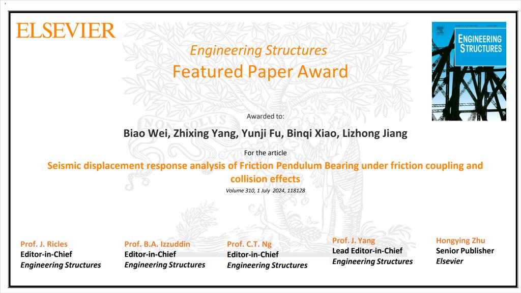 近日,土木工程领域权威期刊《Engineering Structures》编辑部公布了该期刊最佳论文奖(Featured Paper Award)遴选结果。由集团土木工程学院和高速铁路建造技术国家工程研究中心的魏标教授、蒋丽忠教授、杨智星硕士生、肖斌琦博士生和英国曼彻斯特大学的符云集博士生(魏标教授的硕士毕业生)合作完成的发表于该期刊2024年第310卷的论文“Seismic displacement response analysis of friction pendulum bearing under friction coupling and collision effects”荣获该奖。这是新葡的京集团35222vip和高速铁路建造技术国家工程研究中心师生近年来首次荣获该奖项。