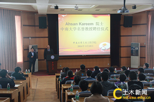 3月18日上午,美国工程院院士、国际风工程协会主席、美国Notre Dame大学土木环境工程和地质科学系Ahsan Kareem教授受聘为我校名誉教授,聘任仪式在铁道校区国际报告厅举行。集团副校长田红旗院士出席并为Ahsan Kareem教授颁发了聘书。美国纽约州立大学布法罗分校助理教授吴腾、校人事处副处长许毅,集团院长谢友均、院党委书记蒋琦玮、副院长盛兴旺、何旭辉、蒋丽忠参加了活动。近百名研究生和本科生聆听了报告。