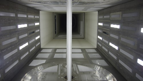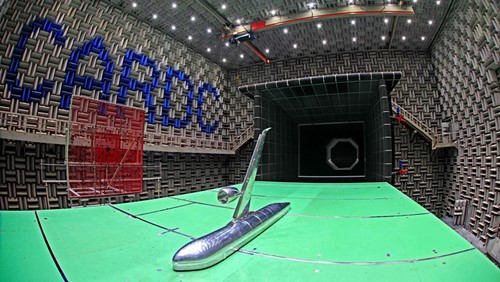 5.5米×4米声学风洞是一座开/闭口试验段两用的低湍流度低噪声回流式低速风洞,是世界上背景噪音最低的大型声学风洞,消声室背景噪音为76.8dB(A);该风洞配备了多功能支撑平台、模型腹撑/尾撑支撑装置、声学测量系统、静态压力测量系统、测力天平等设备,主要承担气动声学试验和气动力试验。