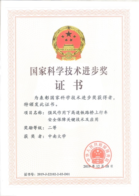 集团共有8项研究成果获奖,其中牵头3项,参与5项。新葡的京集团35222vip主持2项,参与2项。其中,风工程研究中心主任何旭辉教授主持、团队成员邹云峰和敬海泉副教授参与完成的强风作用下高速铁路桥上行车安全保障关键技术及应用荣获国家科学技术进步二等奖(参与人员:韩艳,邹云峰,郭文华,王浩,苏伟,李龙安,敬海泉,文望青,郭向荣)。