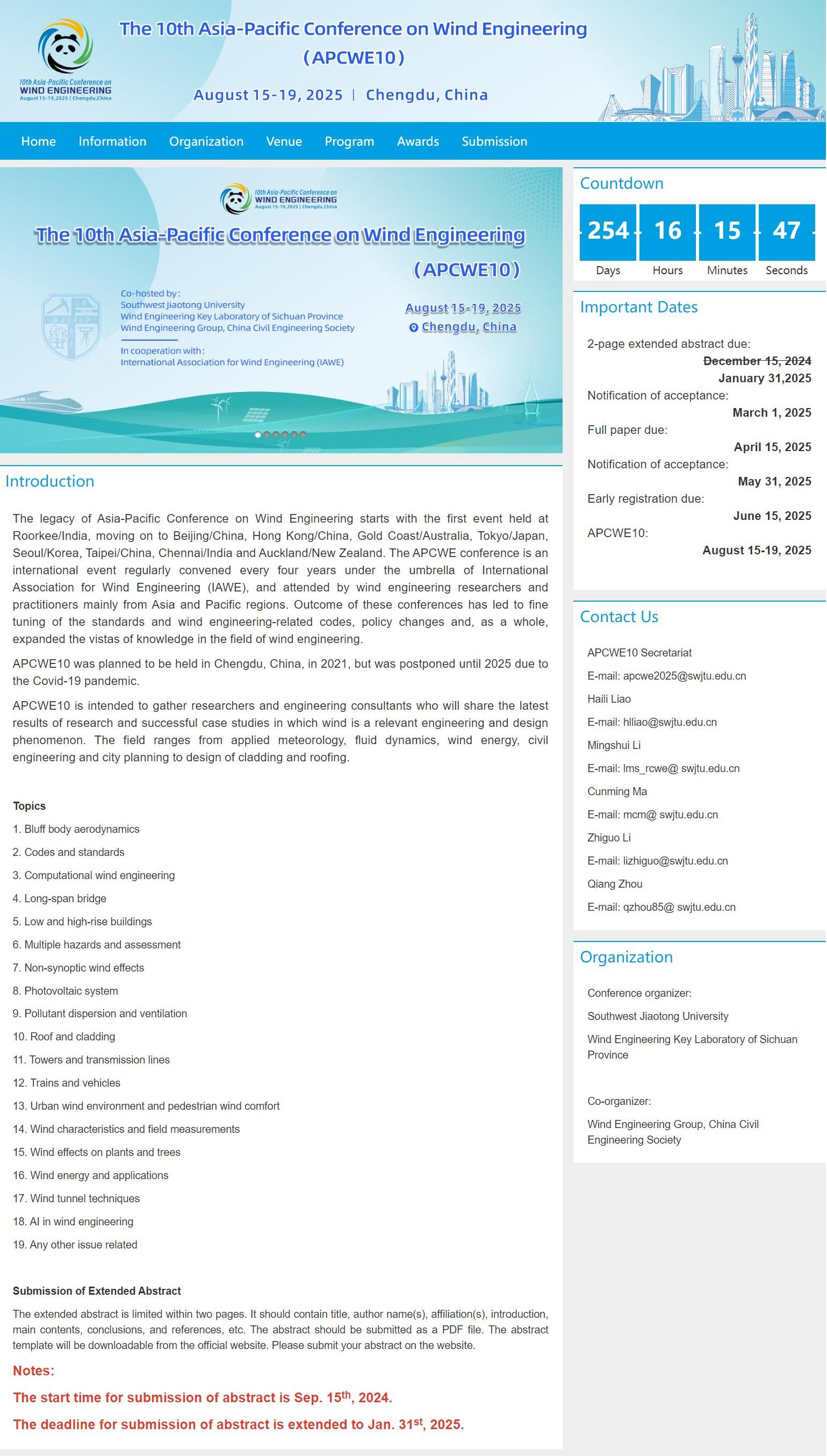 第10届亚太风工程会议(The 10th Asia-Pacific Conference on Wind Engineering, APCWE10)将于2025年8月15日至19日在成都举办。