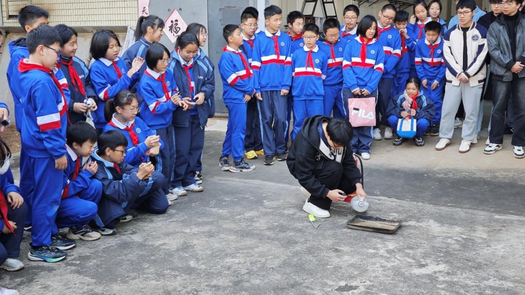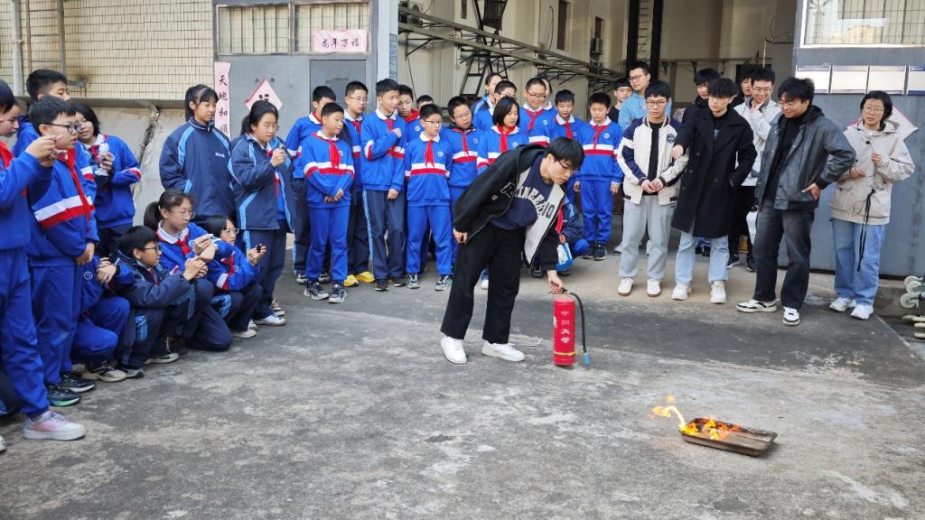最后,硕士生王鑫喜和尚佳亮向同学们讲解了灭火器的灭火原理,并示范了干粉灭火器的正确使用方法。在互动式实践教学中,中学生们学习了消防安全常识和初期火灾扑救技巧,初步掌握了灭火器的操作方法,有效提升了他们的安全意识和应急防范能力。