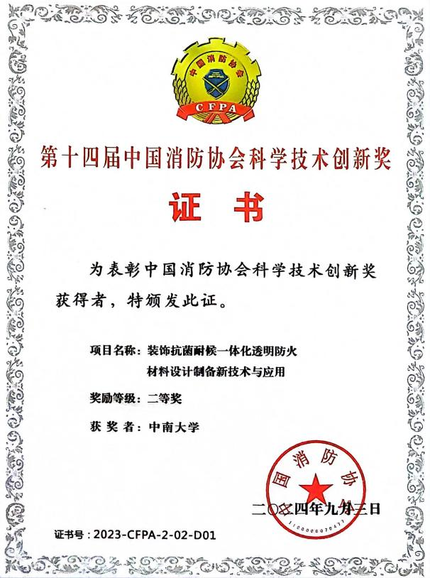 颜龙副教授在装饰抗菌耐候一体化透明防火材料设计制备新技术与应用方面取得了一系列重要研究成果,对提升古建筑消防安全意义重大,受到了专家学者的广泛关注,并因此荣获第十四届中国消防协会科技创新奖二等奖。