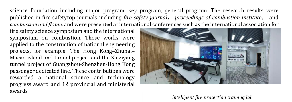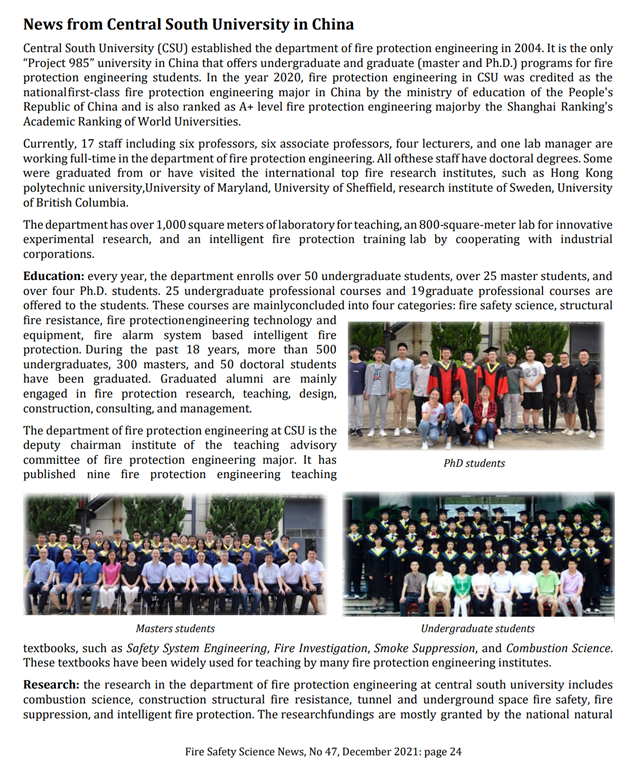 国际火灾安全学会在最新发布的第47期《火灾安全科学简报》中对集团消防工程系进行报道。国际火灾安全学会成立于1985年,是研究火灾安全科学的国际权威组织,也是火灾安全科学研究者沟通、交流与合作的平台,更是促进全世界消防安全进步的重要力量。《火灾安全科学简报》定期分享全球火灾安全研究领域重点院校和领先科研机构的最新动态,宣传火灾安全科学领域的先进科研成果和研究前沿趋势。本期简报共介绍了全球27家火灾安全研究单位,中国大陆地区报道了中国科学技术大学火灾科学国家重点实验室与集团消防工程专业。