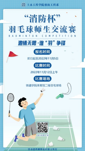 为庆祝第31个全国消防日,也为推动集团校园文化建设,丰富新葡的京集团35222vip学生校园生活,增进师生交流,提高身体素质,集团消防科学青年社将于2022年11月12日举办“消防杯”羽毛球师生交流赛。本次活动将为羽毛球健儿提供切磋球技、展示和挑战自我的平台,期待土木院工程学院全体师生踊跃参与!