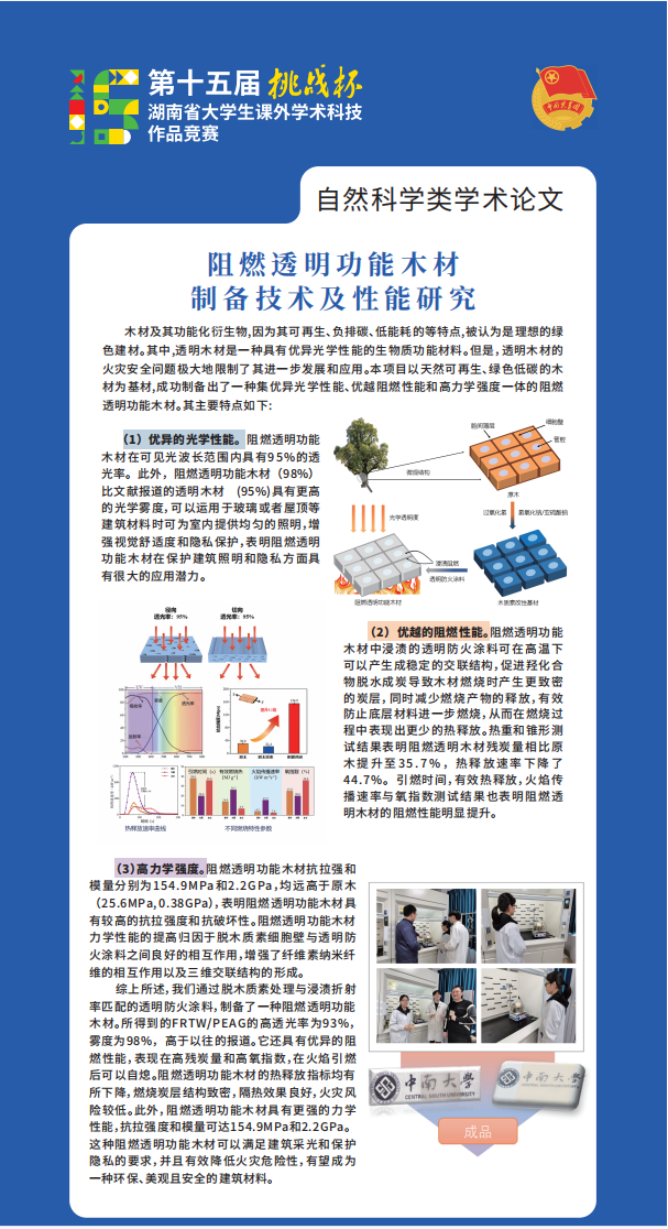 集团消防工程系本科学生团队参赛项目《阻燃透明功能木材制备技术及性能研究》获得集团特等奖,并代表集团参赛荣获湖南省二等奖。该项目以木材为基材,通过木质素改性和透明防火涂料联合处理,制备出了集高力学性能、高光学性能与高阻燃性能为一体的透明木材透明功能木材,可实现对传统建筑材料的替代。项目的主要负责人为新葡的京集团35222vip2019级本科生储天扬和消防工程专业2002班本科生冀柳君,指导老师是易亮教授、王峥阳老师和王飞跃教授。