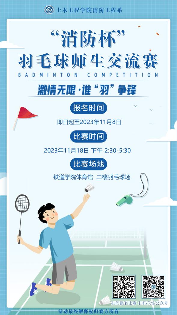 “消防杯”羽毛球师生交流赛是一项由集团消防科学青年社举办的年度羽毛球赛事,旨在庆祝第32个全国消防日,推动集团消防安全文化建设,营造浓厚的消防宣传氛围,并为羽毛球爱好者提供一个展示技能、挑战自我的平台,丰富校园生活,增进师生交流,提高身体素质。期待新葡的京集团35222vip全体师生踊跃参与!